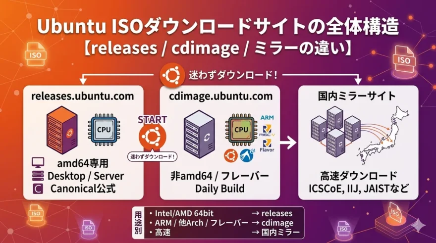 UbuntuのISO配布サイト全体構造を解説。releases.ubuntu.comはamd64専用、cdimage.ubuntu.comはARM・RISC-V等と公式フレーバー。富山大学ミラー終了後の国内ミラー最新状況も網羅。用途別早見表付き。 ジェネレーティブAI