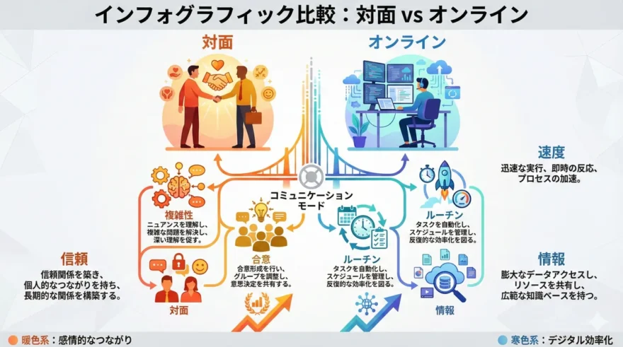 また、ビジネスリサーチラボの伊達洋駆氏は、コミュニケーション研究の知見として「対面は合意形成に向き、オンラインはアイデアの発散に向く」と整理しています。
